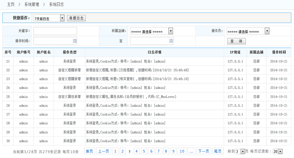 2.查詢日志:根據(jù)條件查詢數(shù)據(jù)(關鍵詞、時間段、按店鋪、按操作員)