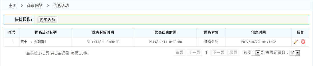 2.編輯:可以對該優(yōu)惠活動修改屬性;可以將該優(yōu)惠活動刪除