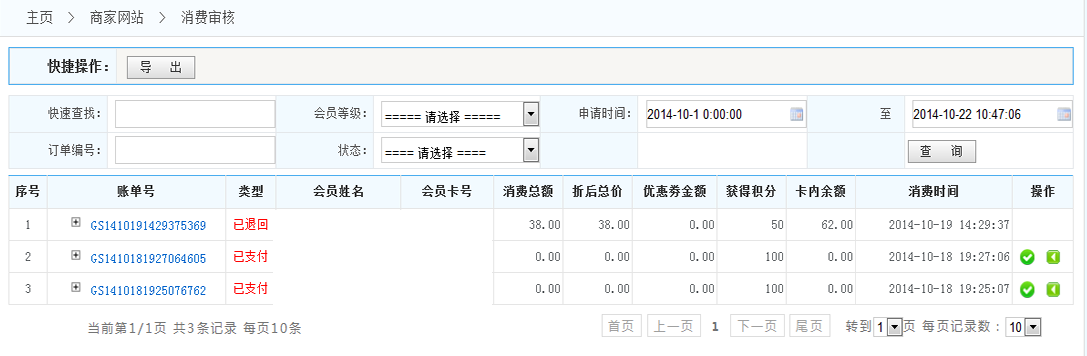 通過審核:點擊通過審核,此消費單才可繼續(xù)進行