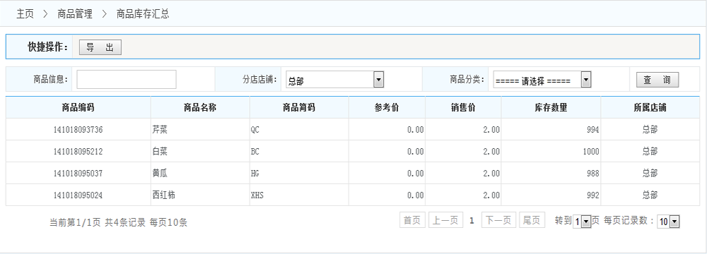 商品庫存匯總: 導出:可以將列表中的數(shù)據(jù)導出到Excel表格 篩選:可以根據(jù)編碼或者簡碼或者名稱 快速找到某個商品 也可以根據(jù)店鋪或者商品分類查詢數(shù)據(jù) 列表:列出所有滿足條件的數(shù)據(jù)(默認是顯示所有的數(shù)據(jù))